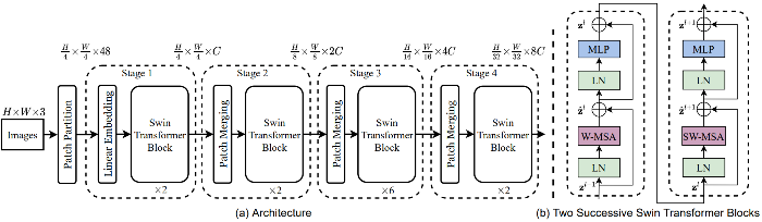 - stage 1: Transformer ํ์ต์ ์ํด ์ฌ์ฉ์๊ฐ ์ ์ํ C์ฐจ์์ผ๋ก ๋งคํํด์ค(Linear Embedding), ์ฌ๊ธฐ์ 2๊ฐ๋ก ๊ตฌ์ฑ ๋ swin transformer block์ผ๋ก ์ ๋ ฅ๋์ด ๋์ผํ ์ฐจ์์ผ๋ก ์ถ๋ ฅ๋จ (H/4*W/4*C)