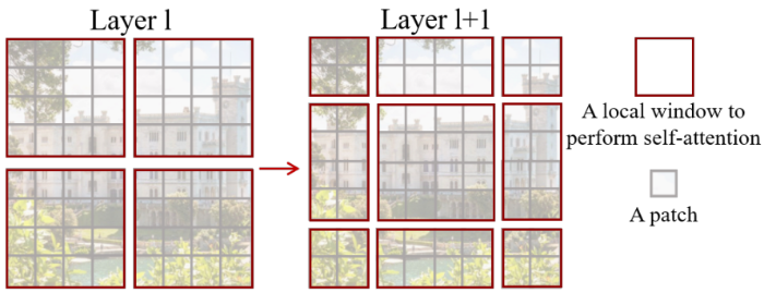 * window ์์์๋ง attention์ฐ์ฐ์ ํ ํ, ๊ฐ๊ฐ window๋ผ๋ฆฌ attention ์ฐ์ฐ์ ํ๋ ํํ์ด๋ค.