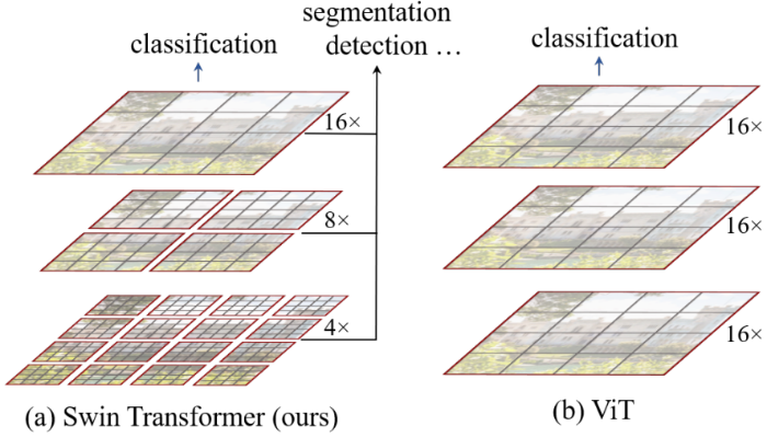 * Swin Transformer = Vit + 1.๊ณ์ธต์ ๊ตฌ์กฐ + 2. shift window ๋ผ๊ณ ํ ์ ์๋ค.