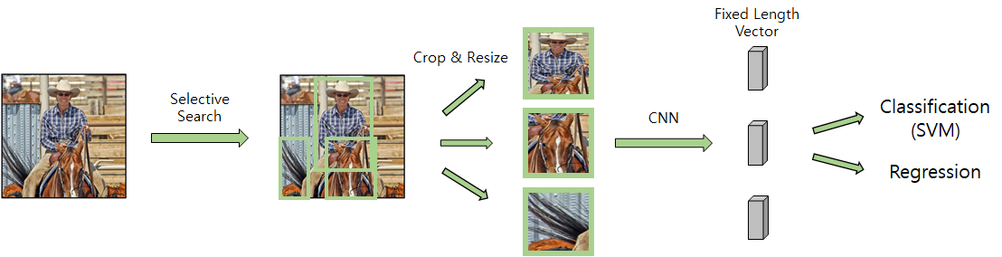 (1) region proposals๋ก object ์์น๋ฅผ ์์๋ด๊ณ , ์ด๋ฅผ CNN์ ์ ๋ ฅํ์ฌ class๋ฅผ ๋ถ๋ฅ