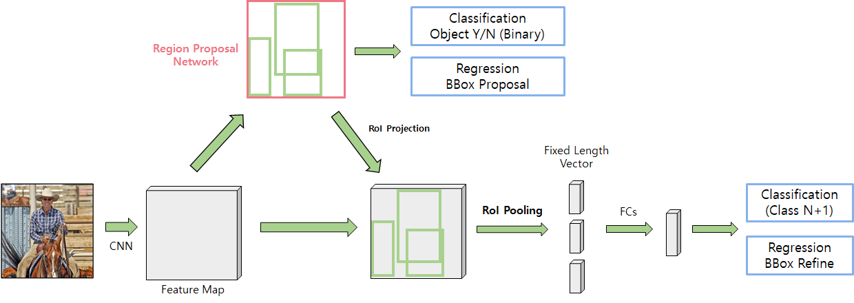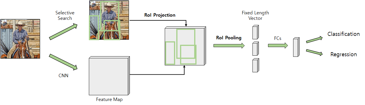 - Fast R-CNN์์๋ ํด๋น ์์ญ(์ด๋ก์ ๋ฐ์ค)์ Feature๋ฅผ ์๋ณธ ์ด๋ฏธ์ง์์ ์ถ์ถ(Crop)ํ๋ ๊ฒ์ด ์๋๋ผ Feature Map๋จ์์ ์ถ์ถ -> ์ ๋ ฅ ์ด๋ฏธ์ง๋ง๋ค ๋จ ํ๋ฒ์ CNN๋ง์ ์ํํ๋ฉด ๋จ.