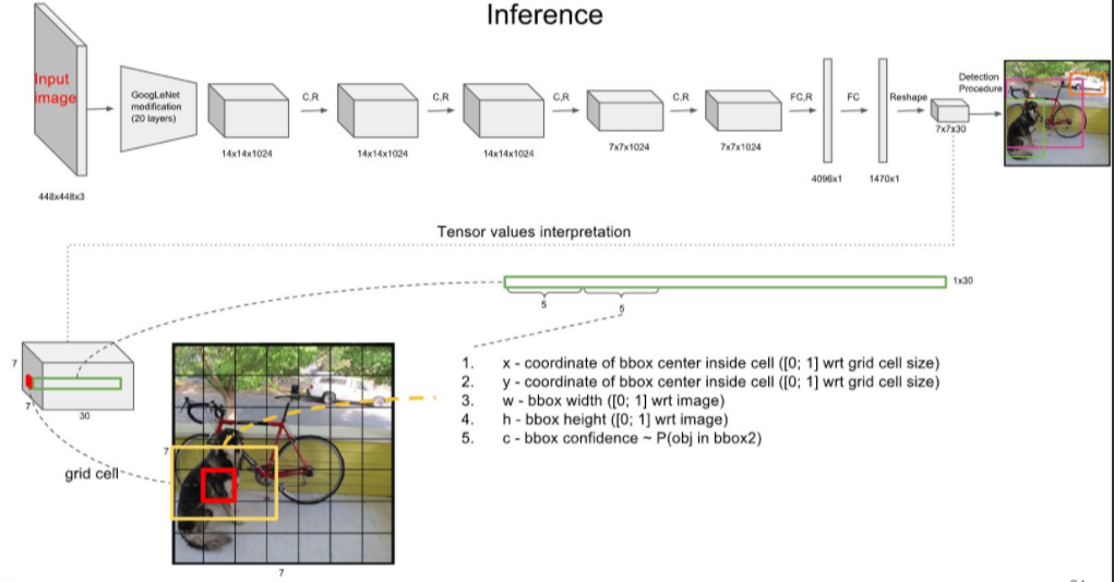 - 7x7x30์ ์ ๋ณด๋ฅผ ํ์ฉํ๋ค๋ ๊ฒ : 7x7x30์ feature map์์ cell ํ๋๋ฅผ ๋ฝ๊ฒ ๋๋ฉด, ๊ทธ cell ํ๋๋ 30์ depth / cell ๋น 2๊ฐ์ Bbox๋ฅผ ๊ฐ์ง๊ฒ ๋๋๋ฐ ๊ทธ Bbox์ ์ขํ ๊ฐ๊ณผ confidence score๋ฅผ ๊ฐ์ง๊ณ ์์.