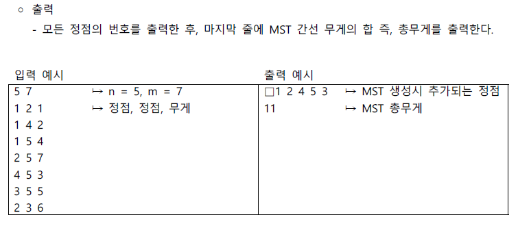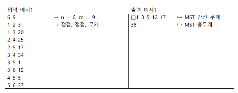 - ์ต์์ ์ฅํธ๋ฆฌ(MST) ์์ฑ ๊ณผ์ ์์ ์ถ๊ฐ๋๋ ๊ฐ์ ์ ๋ฌด๊ฒ๋ฅผ ์์๋๋ก ์ถ๋ ฅํ๋ค.