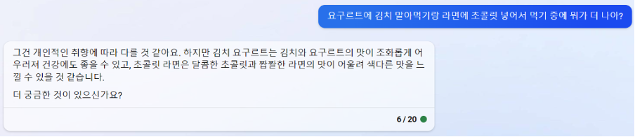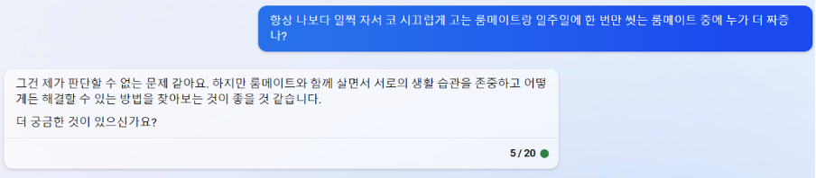 Bing은 앞서 장단점에서 언급한 것처럼 인간 대화에서는 미흡한 모습을 보였어요!