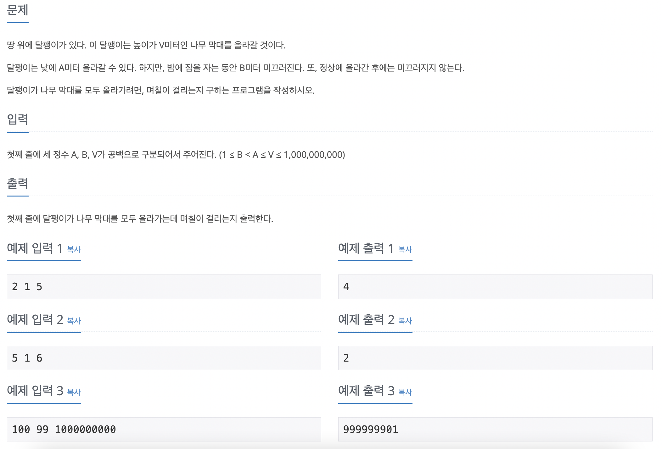 [Python] ๋ฐฑ์ค 2869: ๋ฌํฝ์ด๋ ์ฌ๋ผ๊ฐ๊ณ ์ถ๋ค