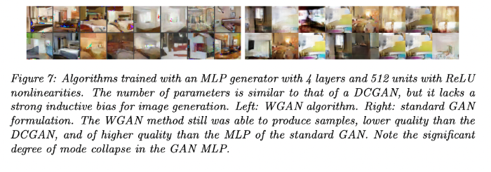 figure7์, generator๋ฅผ MLP + ReLU๋ก ๋ณํํ์ฌ ์คํํ ๊ฒฐ๊ณผ์ด๋ค. ์ผ์ชฝ์ WGAN, ์ค๋ฅธ์ชฝ์ ์ผ๋ฐ์ ์ธ GAN์ ๊ฒฐ๊ณผ๋ก, DCGAN์ ์ฌ์ฉํ์ ๋ ๋ณด๋ค ํ๋ฆฌํฐ๋ ๋จ์ด์ก์ง๋ง mode collapse ํ์์ ๋ํด์ ๋น๊ตํด ๋ณผ ์ ์๋ค. ์ค๋ฅธ์ชฝ์ ๊ฒฝ์ฐ ๋น์ทํ ๊ทธ๋ฆผ์ด ๋ง๊ณ ํน์ ๊ทธ๋ฆผ์ ๋ํด์๋ ์์ฑํ์ง ๋ชปํ์์ง๋ง, ์ผ์ชฝ์ ๋ค์ํ ๊ทธ๋ฆผ์ ๋น์ทํ๊ฒ ์์ฑํ ๊ฒ์ ๋ณผ ์ ์๋ค!