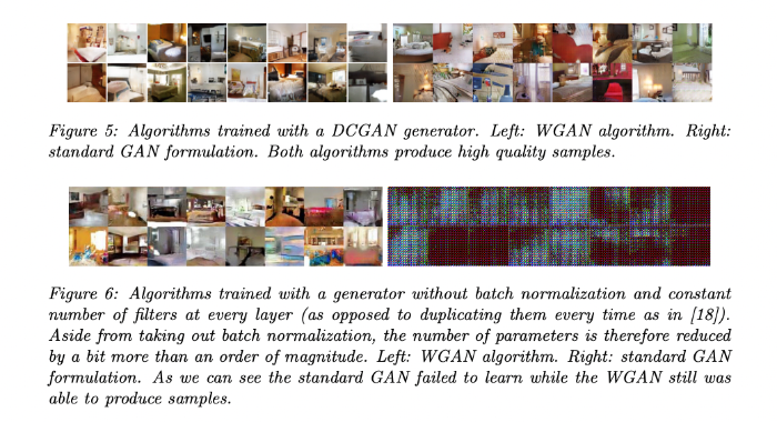 figure5๋ ์ผ๋ฐ์ ์ธ GAN๊ณผ WGAN์ผ๋ก ์ด๋ฏธ์ง๋ฅผ ์์ฑํ ๊ฒฐ๊ณผ์ด๋ค.$(DCGAN generator ์ด์ฉ)$ ๋ ๋ค ์ข์ ์ง์ sample์ ์์ฑํ๋ค.