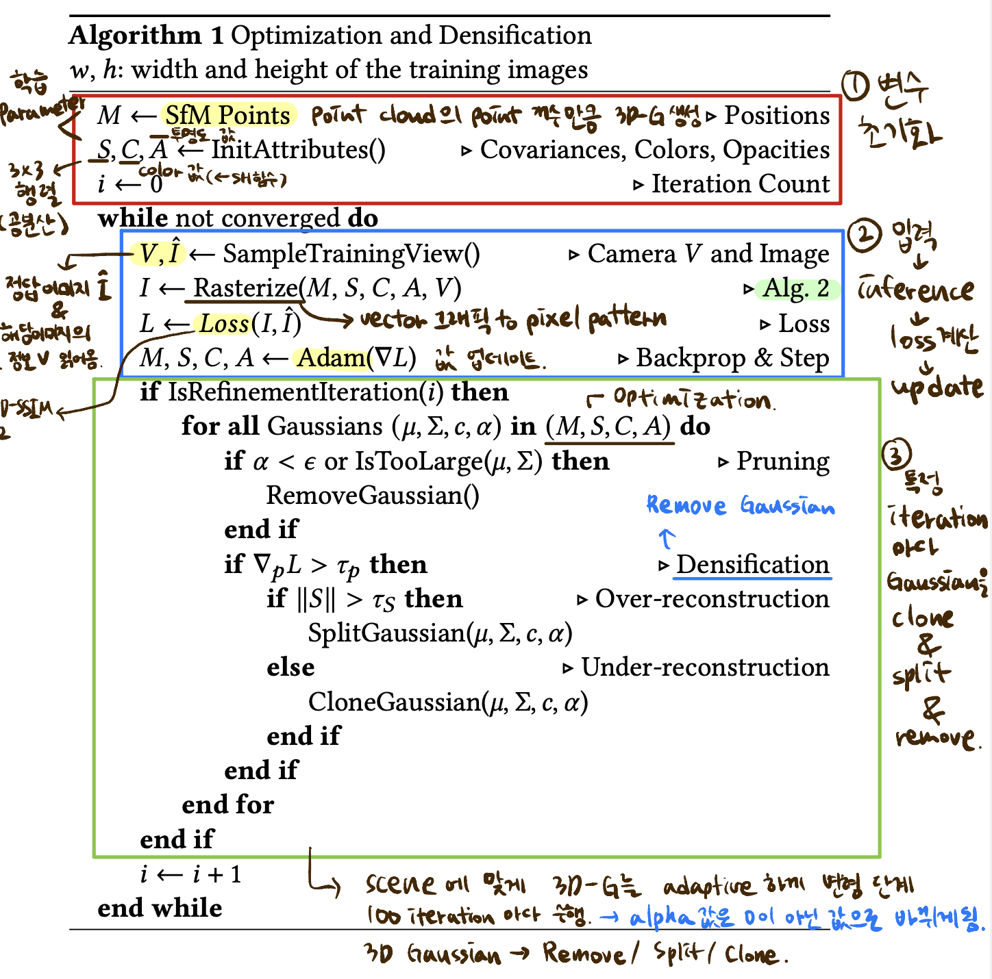 - 세번째 초록 박스 부분은 특정 iteration 마다 Gaussian을 remove, clone, split하는 부분이다.