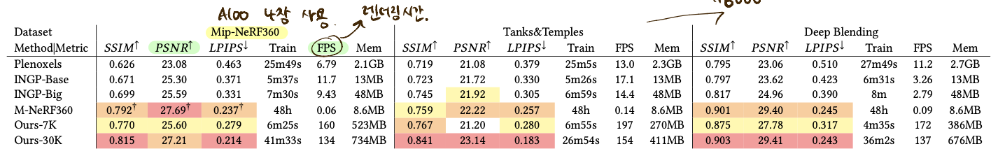 Mip-NeRF360은 A100 4장을 사용하였고, 나머지는 A6000을 사용했다고 한다. FPS는 랜더링 시간을 의미한다.