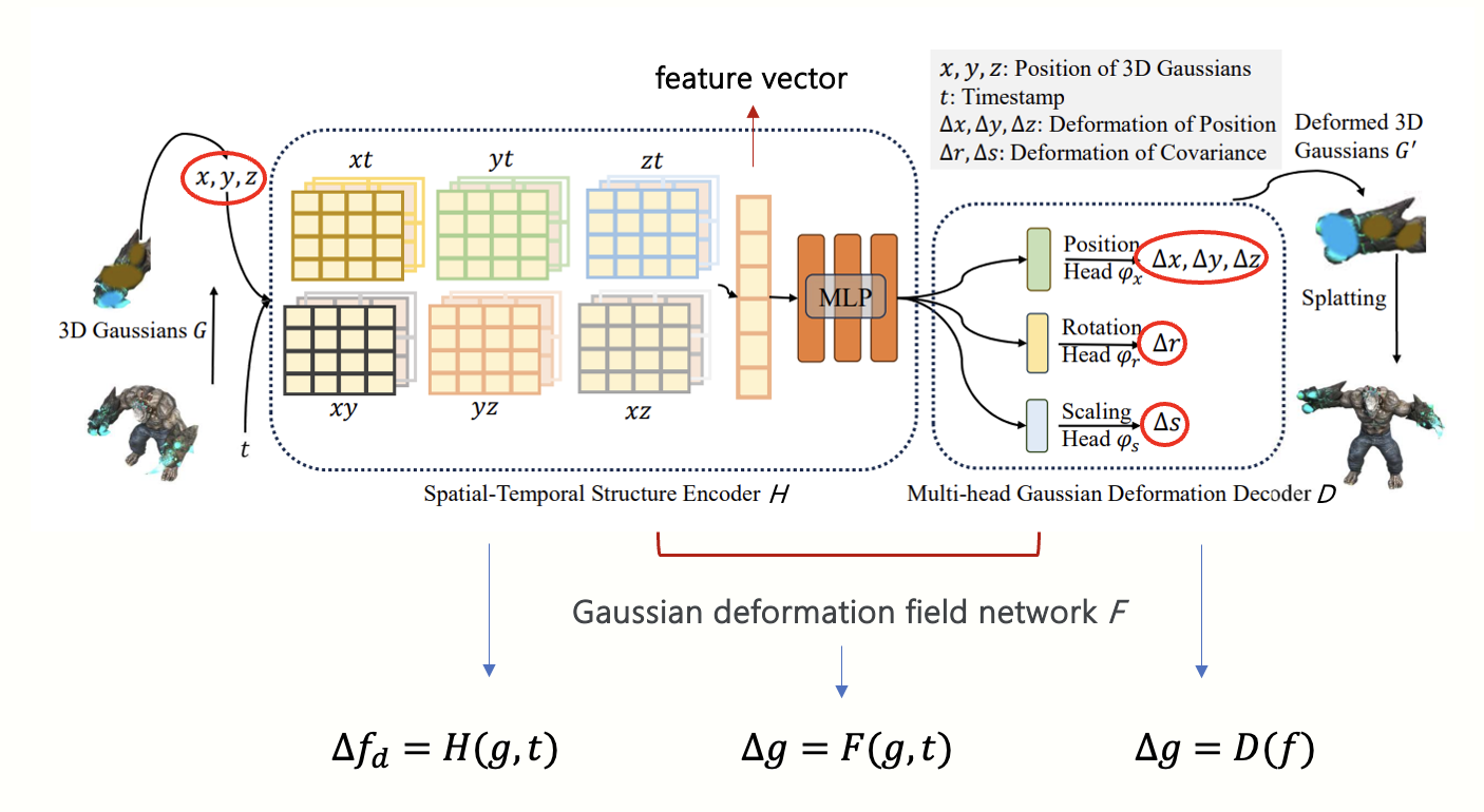 ์ด ๋ณํ๋์ Deformation Field๋ก ํํํ๊ณ , ( 3D Gaussian์ ์ ๋ ฅ์ผ๋ก) ์ผ๋ง๋ ๋ณํ์์ผฐ๋์ง ๋ํด ๋ค์๊ณผ ๊ฐ์ด ์ถ๋ ฅํ๋ ๊ฒ์ ํ์ธํ ์ ์๋ค.