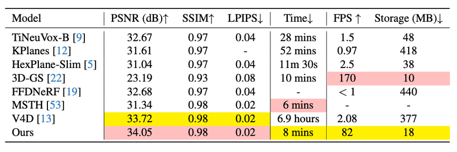 ๊ถ๊ทน์ ์ผ๋ก 4D Gaussian Splatting ํตํด ํจ์จ์ ์ธ ํ์ต ํจ์จ์ฑ๊ณผ ์ค์๊ฐ ๋ ๋๋ง์ ์ป์ ์ ์๋ค.
