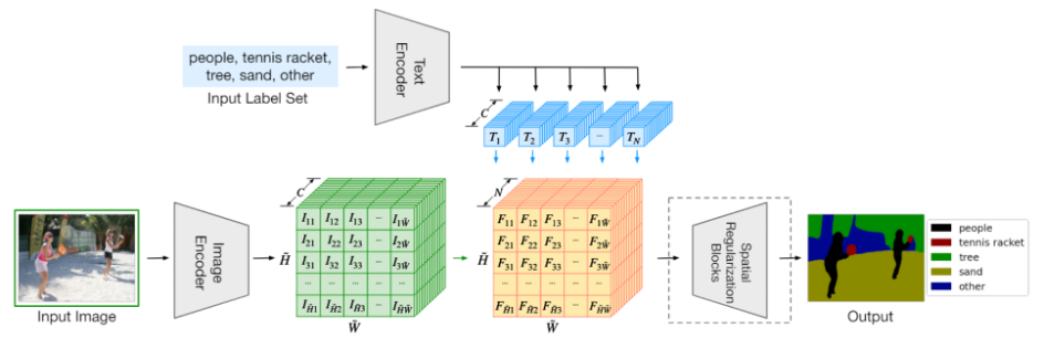 LSeg๋ (DPT ์ํคํ ์ฒ๊ฐ ํฌํจ๋ )์ด๋ฏธ์ง feature ์ธ์ฝ๋์ CLIP์ ํ ์คํธ ์ธ์ฝ๋๋ฅผ ํ์ฉํ์ฌ ํ ์คํธ-์ด๋ฏธ์ง ์ฐ๊ฒฐ์ 2D ํฝ์ ๋ ๋ฒจ๋ก ํ์ฅํ์๋ค.